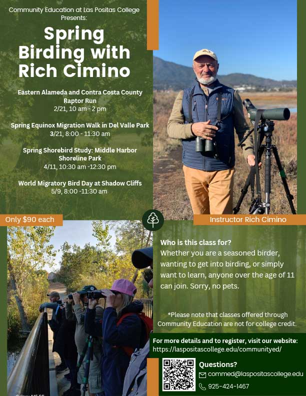 Join us for our unique birdwatching opportunities in eastern Alameda County’s Del Valle and Shadow Cliffs. Discover the fall migration, post-breeding journeys of our local birds. Cost $90 each.